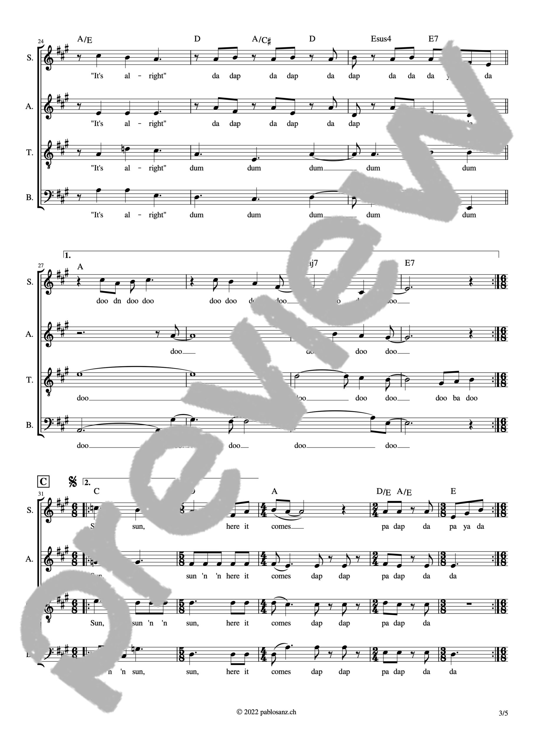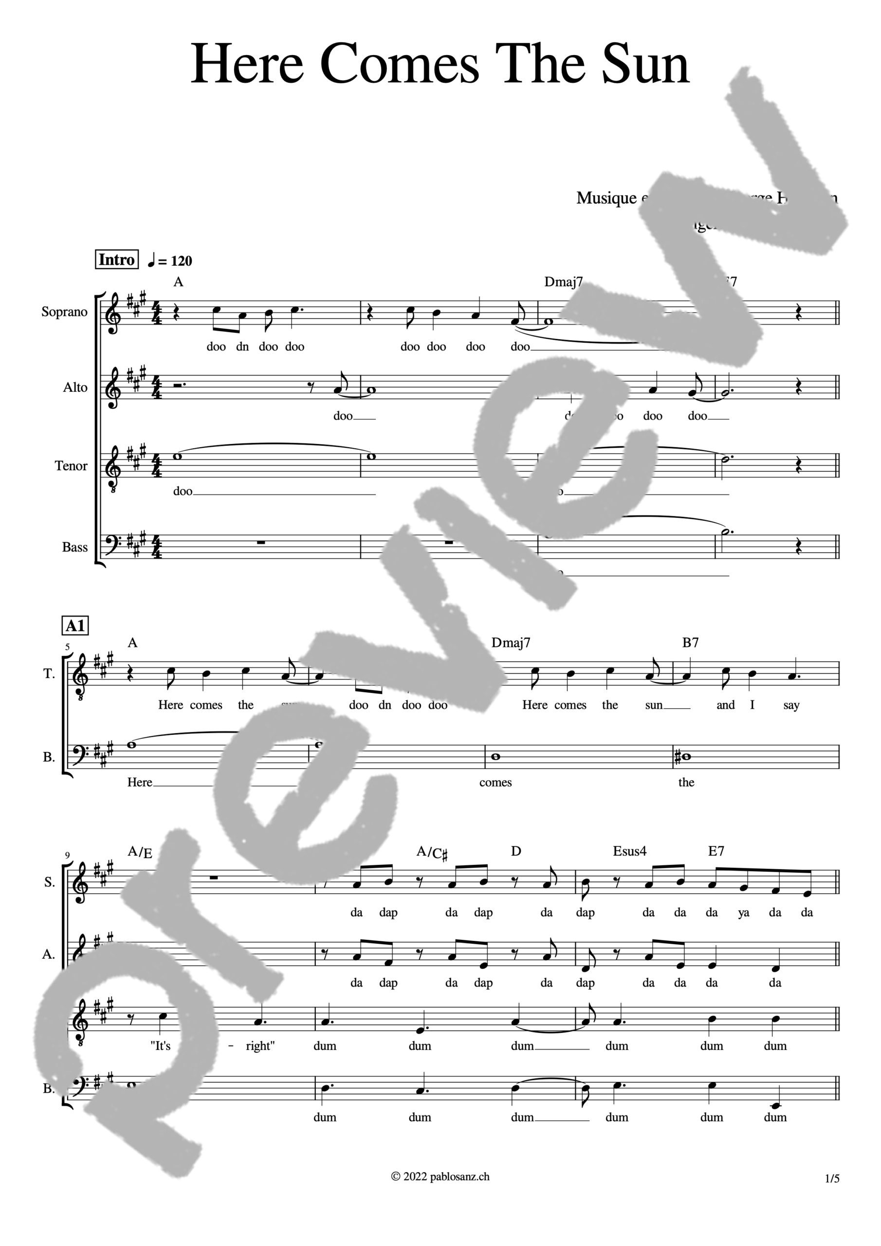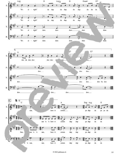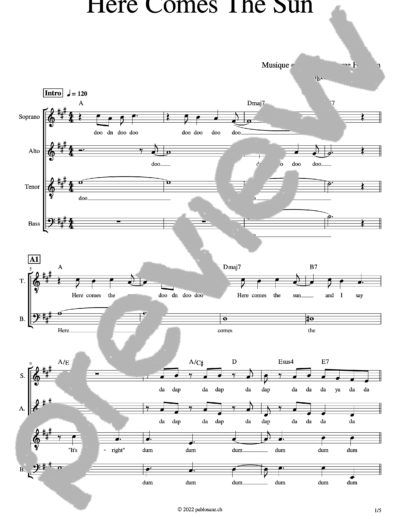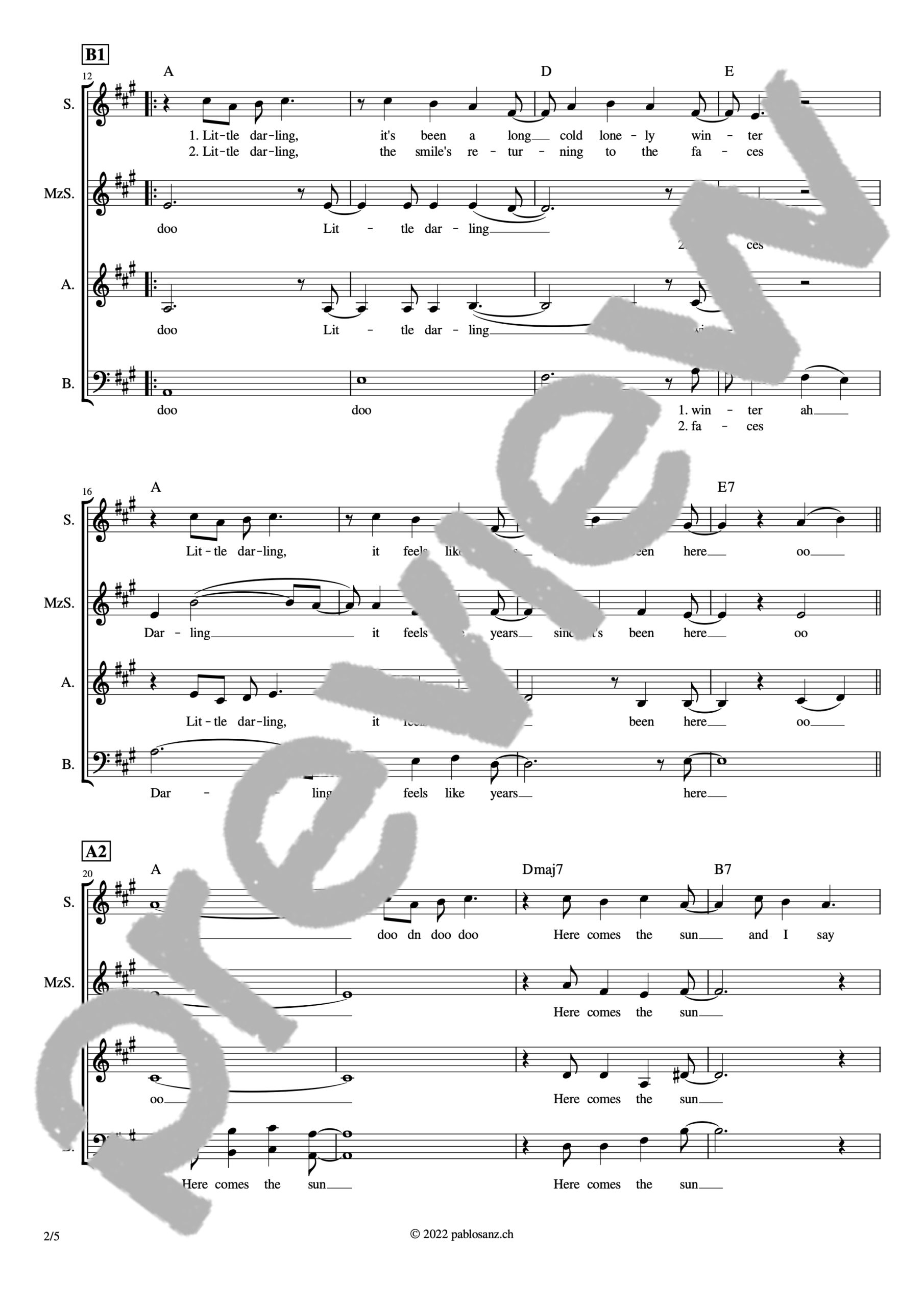 Une chanson emblématique des Beatles qui réchauffe comme un rayon de soleil ! Outre les différents échos et réponses entre les voix, qui s’entrelacent par moments, de fréquentes homorythmies font ressortir les harmonies lumineuses de ce titre. La mélodie principale est partagée entre les sopranos et les ténors. Un climax est atteint lors du refrain, section aux signatures rythmiques complexes mais relativement intuitive. 5 pages.