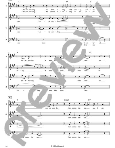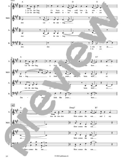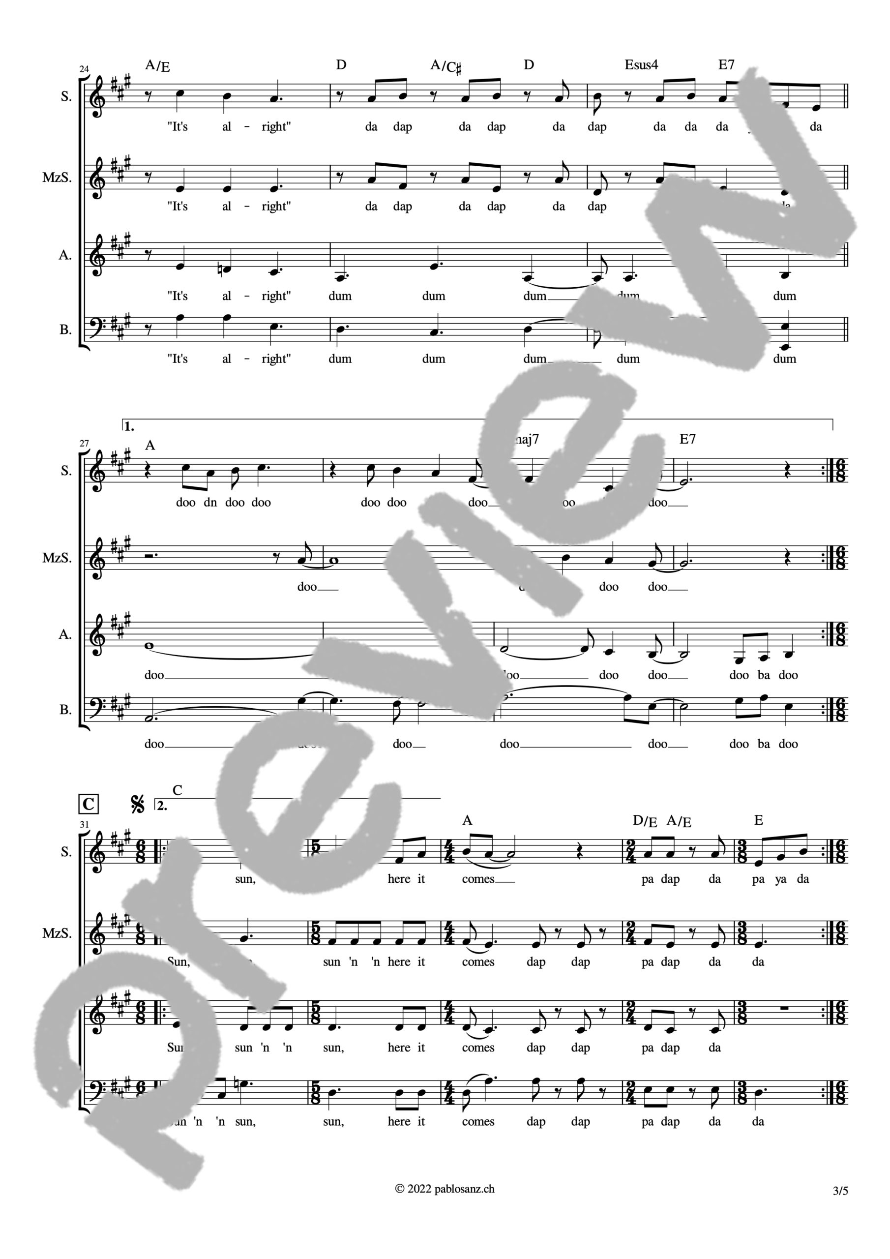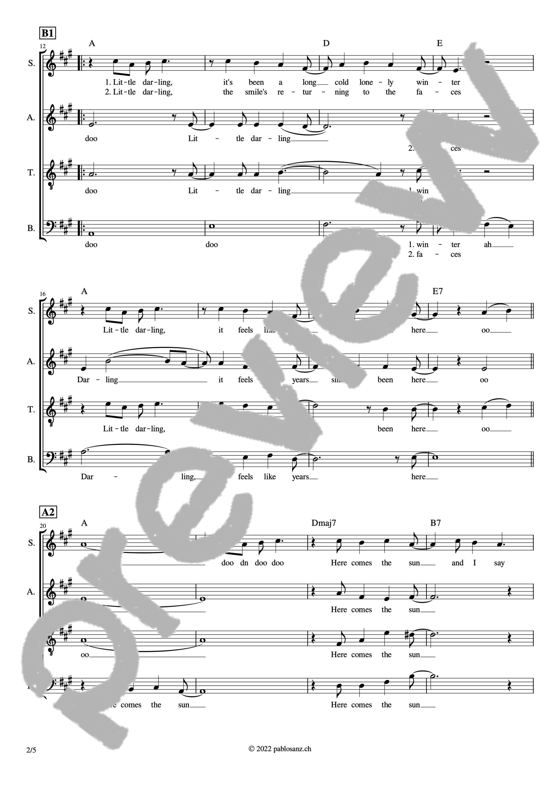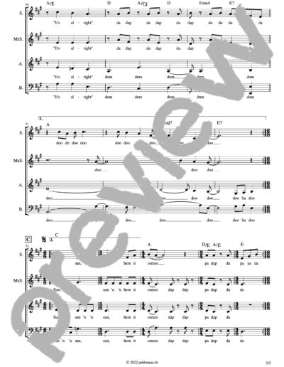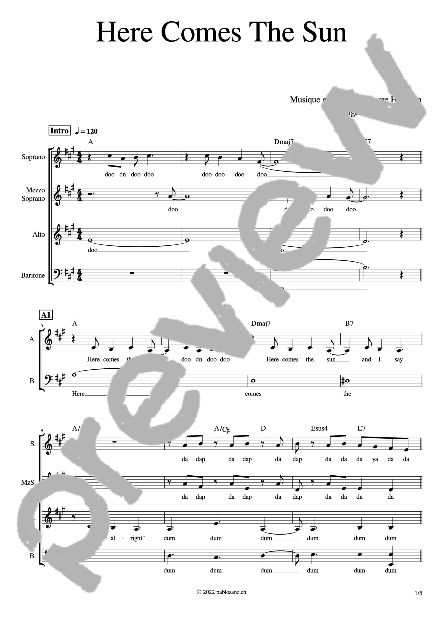Une chanson emblématique des Beatles qui réchauffe comme un rayon de soleil ! Outre les différents échos et réponses entre les voix, qui s’entrelacent par moments, de fréquentes homorythmies font ressortir les harmonies lumineuses de ce titre. La mélodie principale est partagée entre les sopranos et les ténors. Un climax est atteint lors du refrain, section aux signatures rythmiques complexes mais relativement intuitive. 5 pages.