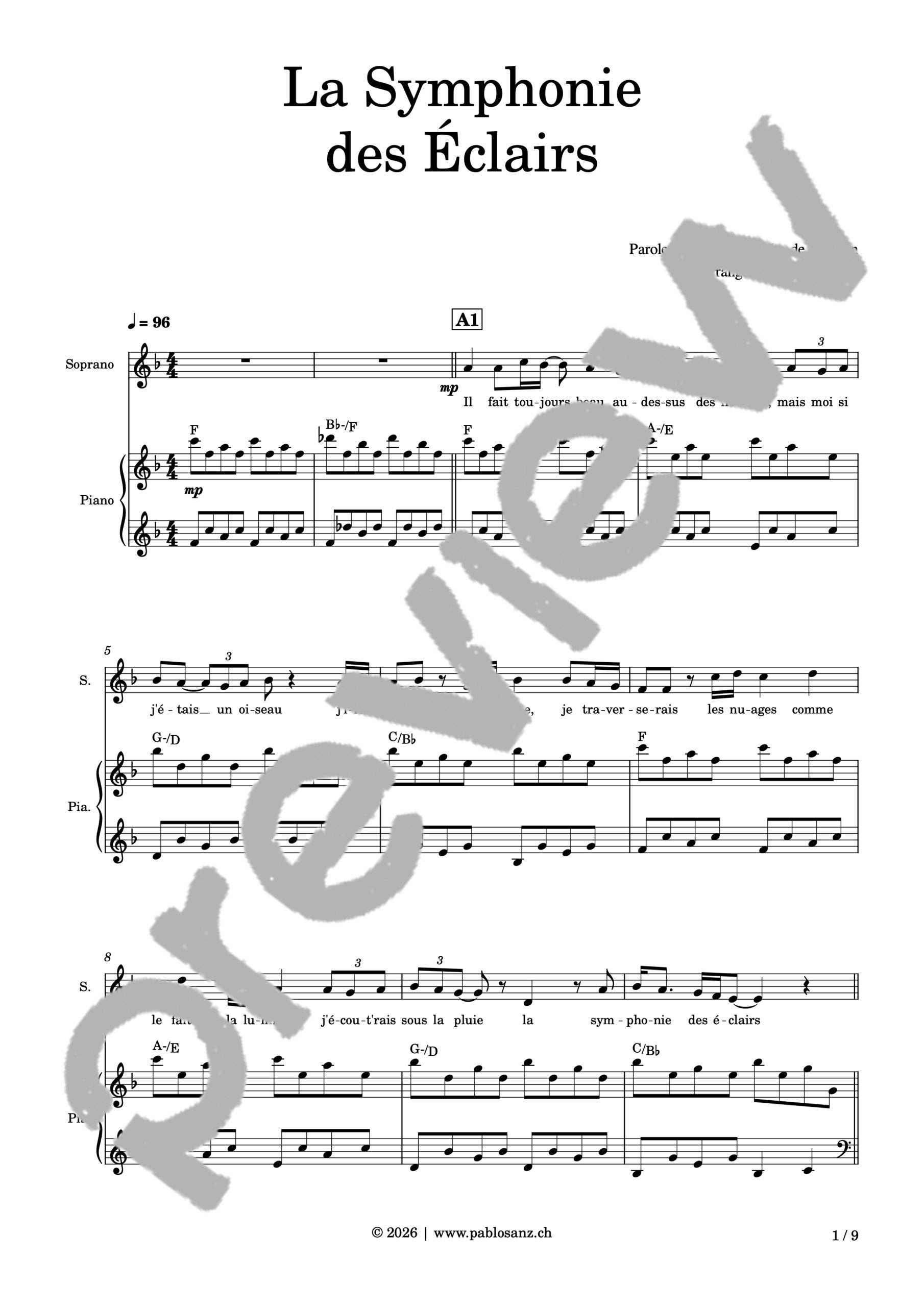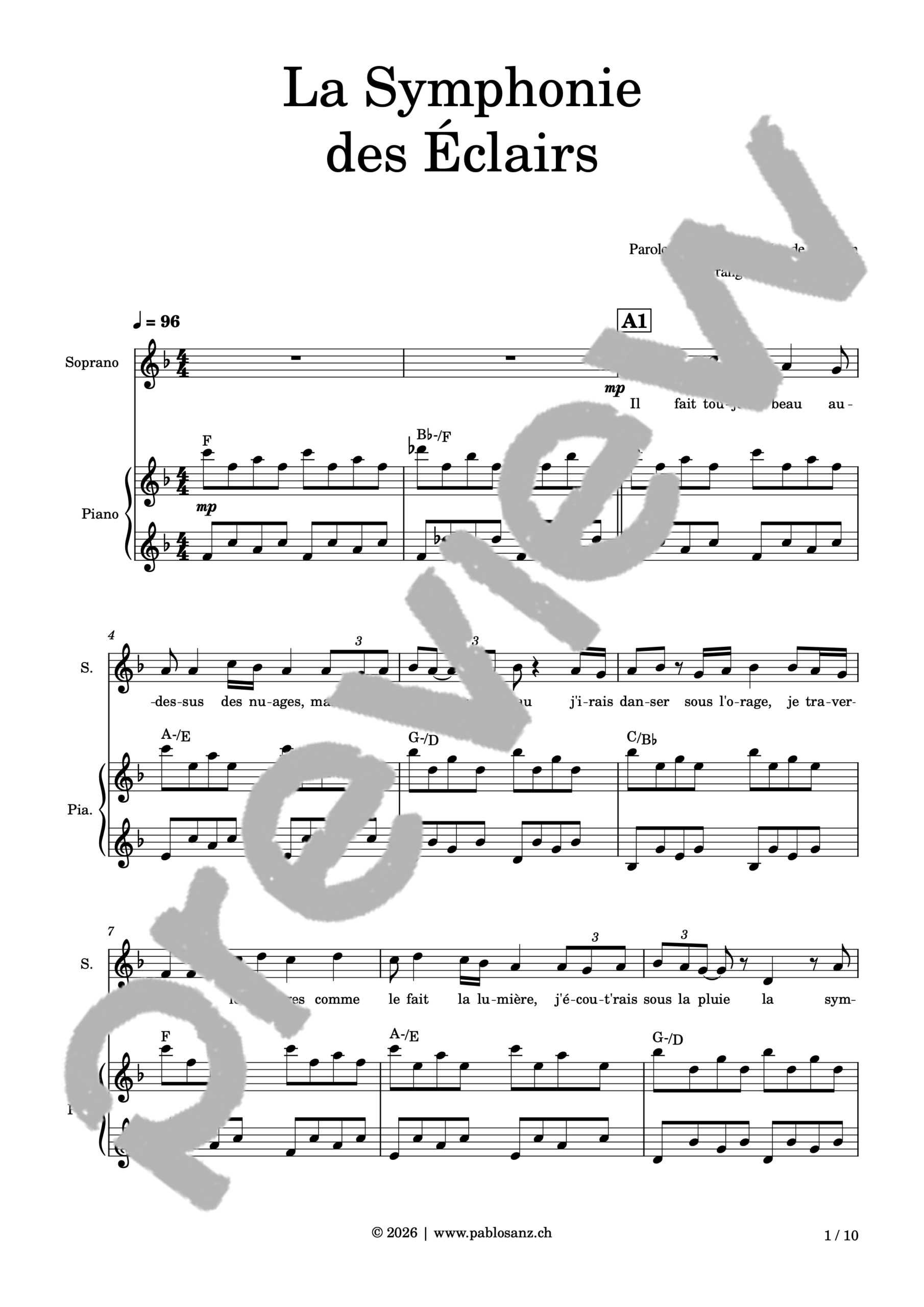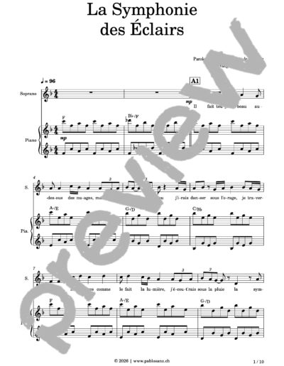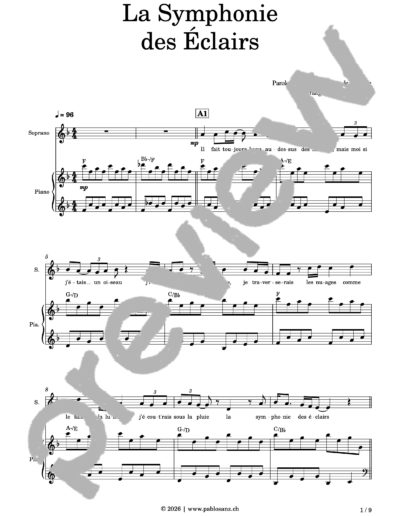 Du même nom que son premier album sorti en studio, La Symphonie des Éclairs est un des titres phare de la chanteuse française Zaho de Sagazan. Une chanson douce qui nous emmène sur un tapis nuageux mais dont les rythmes « secs » et les consonnes bien marquées nous font rester vifs, l’ensemble donnant un peu l’impression de vivre un rêve éveillé. La mélodie des couplets, pouvant s’avérer relativement complexe, est entonnée tour à tour par l’un des registres, les autres créant des tapis harmoniques simples. Les refrains et la coda sont entonnés en homorythmie pour un rendu puissant. La pièce se termine avec un dernier refrain en solo, pour un atterrissage en douceur. La partition comporte un accompagnement pour piano complet. Disponible en version SAT (9 pages) et SATB (10 pages).