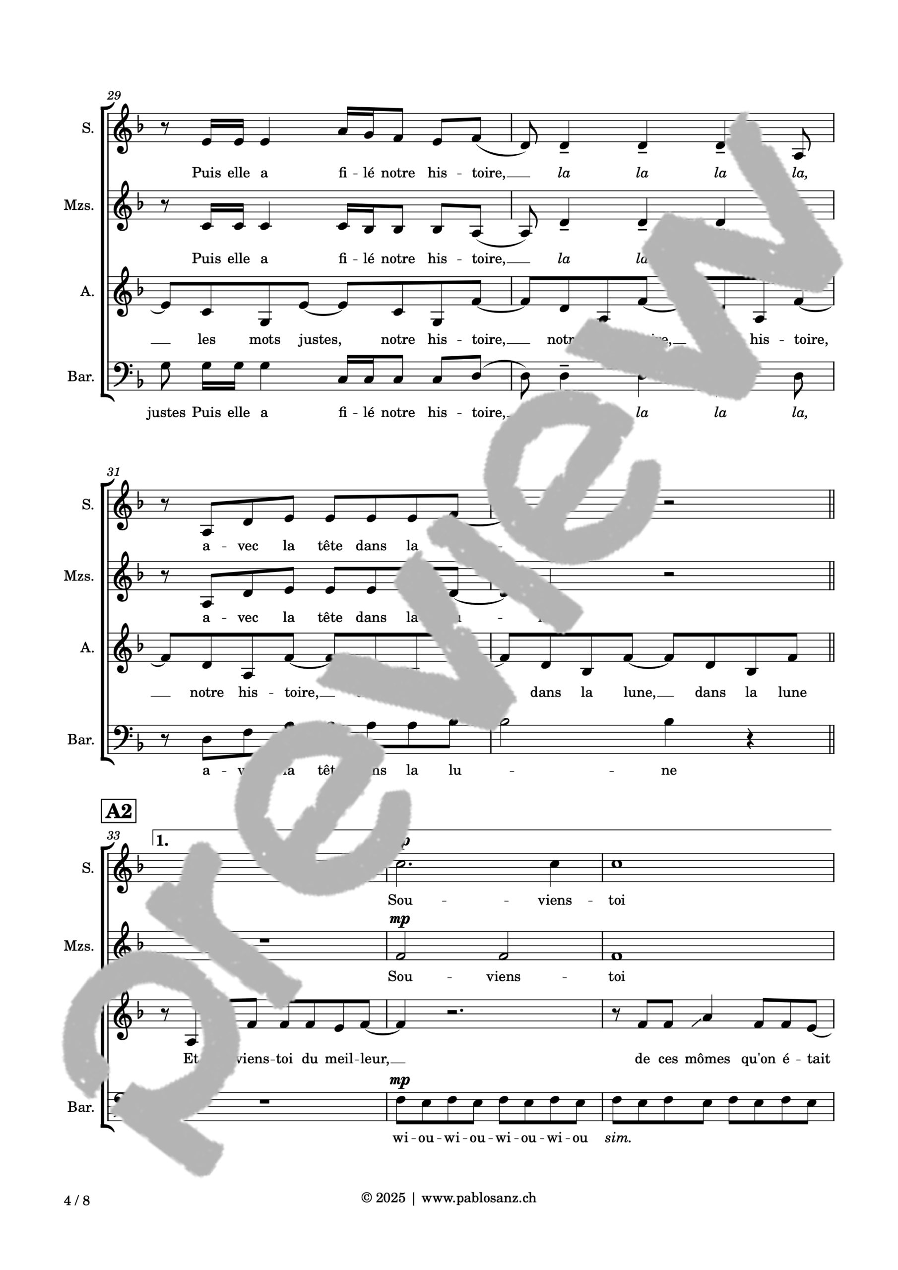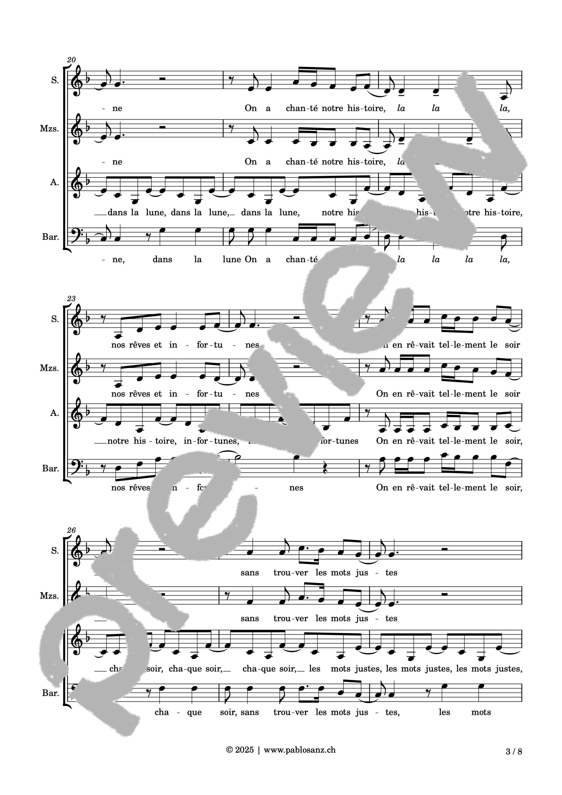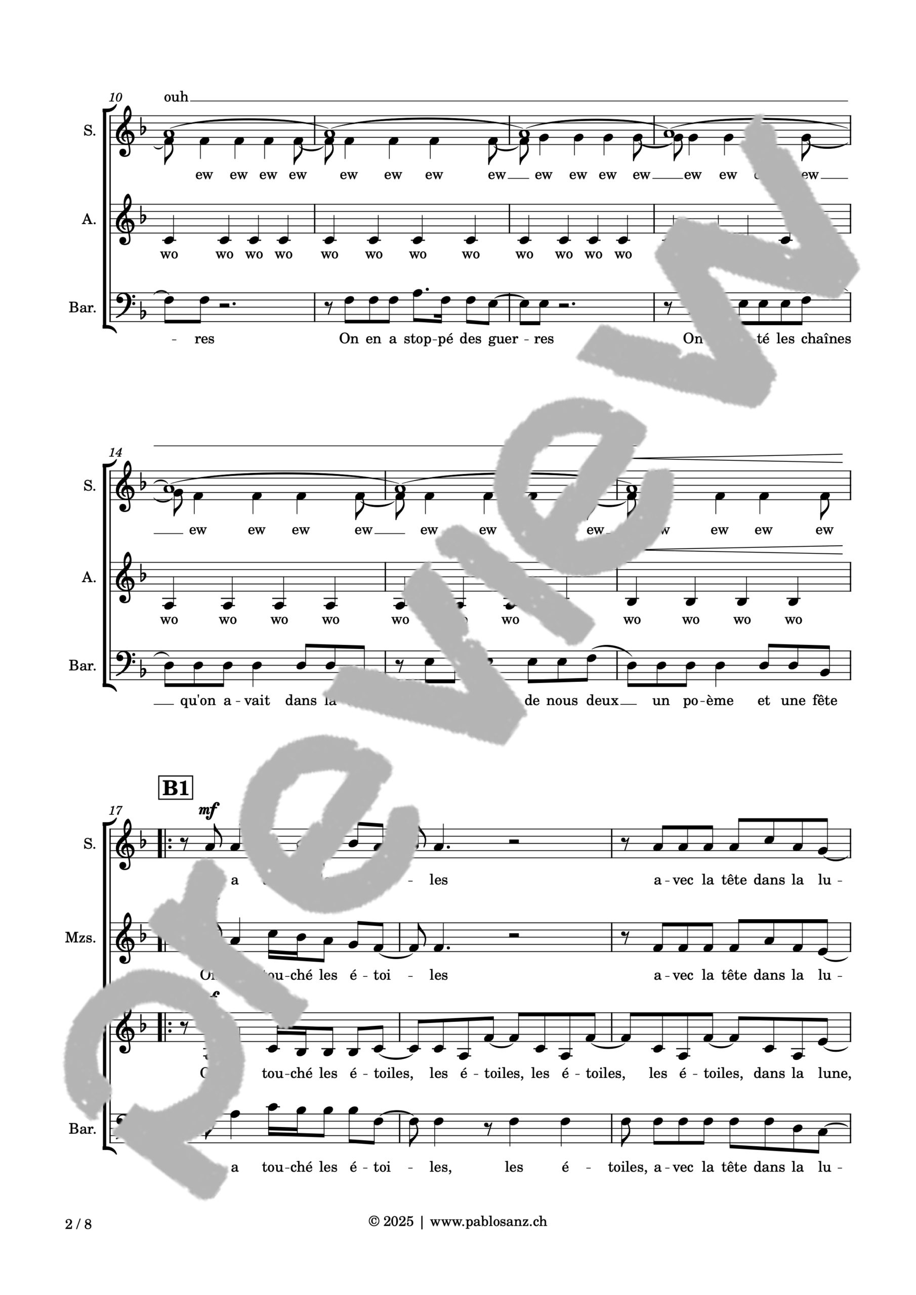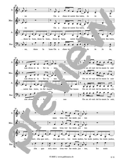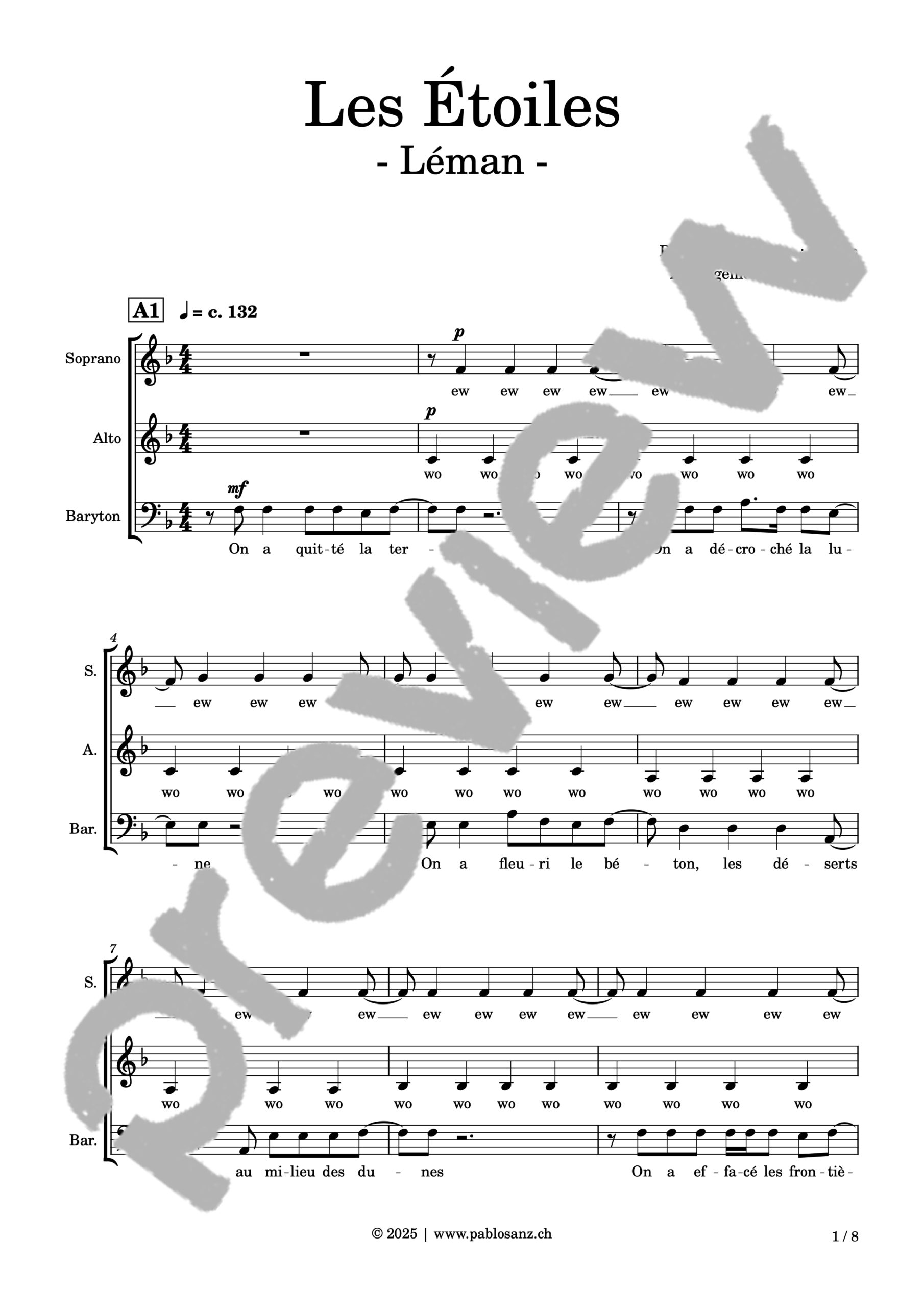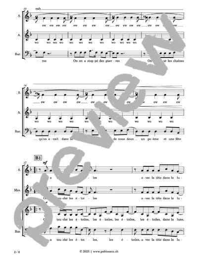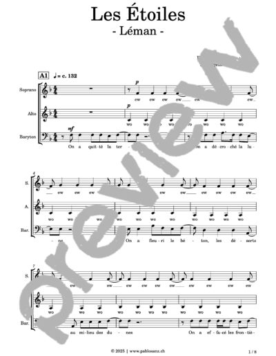 Voici le titre phare de Léman, artiste originaire de Genève, où l’amour nous est conté par un voyage au travers des étoiles, ces astres si lointains, si mystérieux et insaisissables, aussi nobles que le plus magnifique des sentiments humains. Écrit pour une exécution a capella, le présent arrangement essaie de retranscrire l’aspect disco/pop et la légèreté de la pièce par des effets de voix à la fois simples et hypnotisants. La mélodie principale est entonnée par chaque registre alternativement. Malgré la longueur de la pièce, beaucoup de parties se révèlent très faciles à assimiler et hormis quelques rythmiques délicates concernant la mélodie, cet arrangement est très abordable. 8 pages.