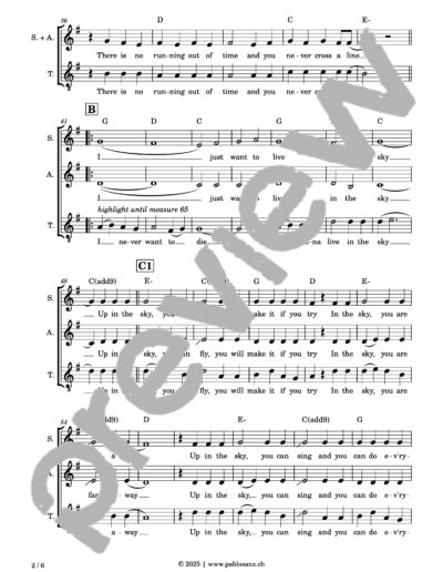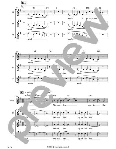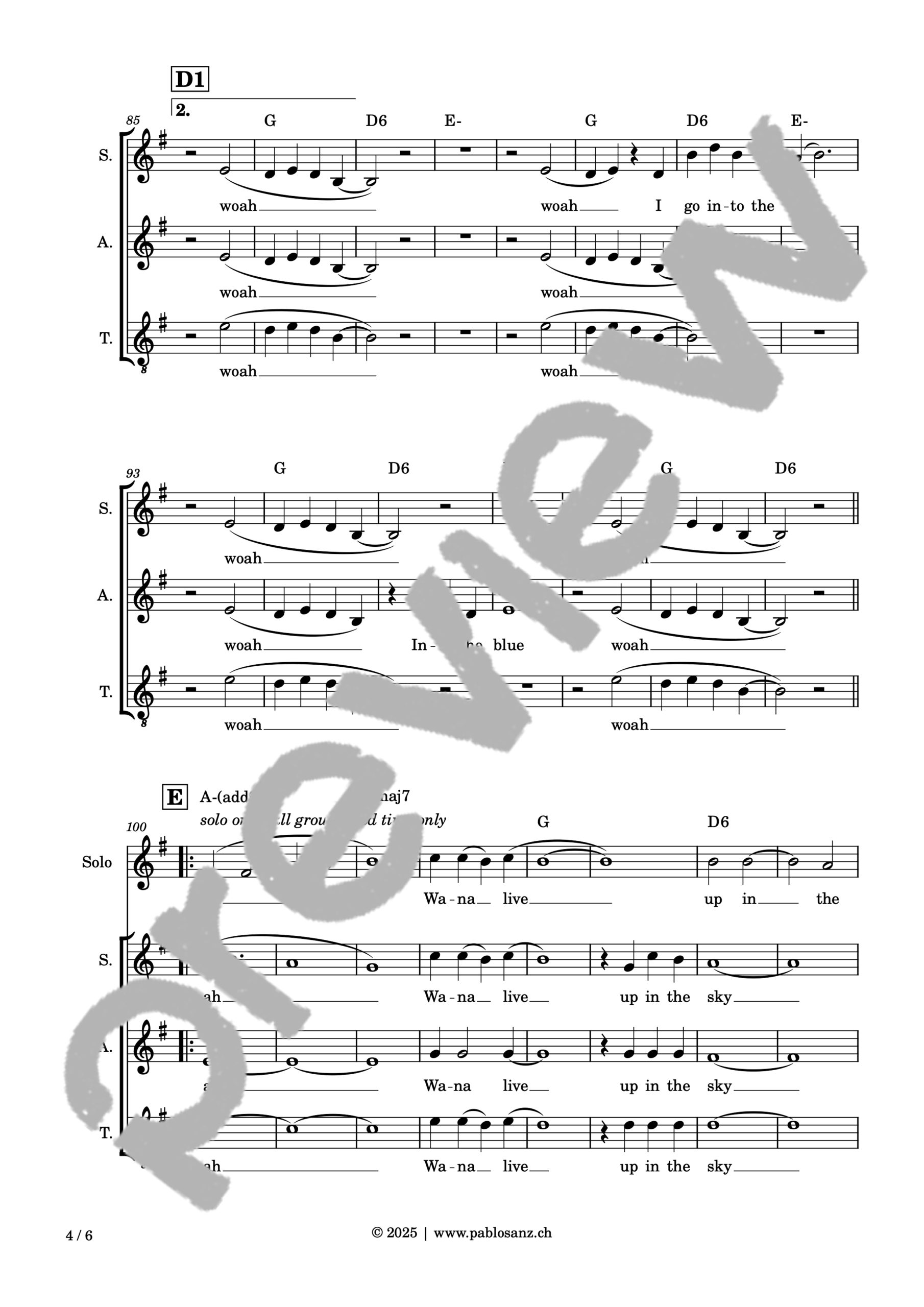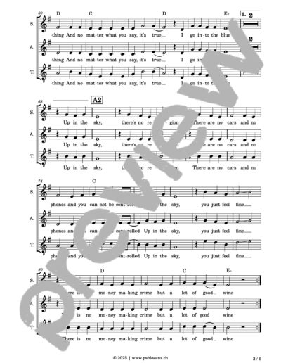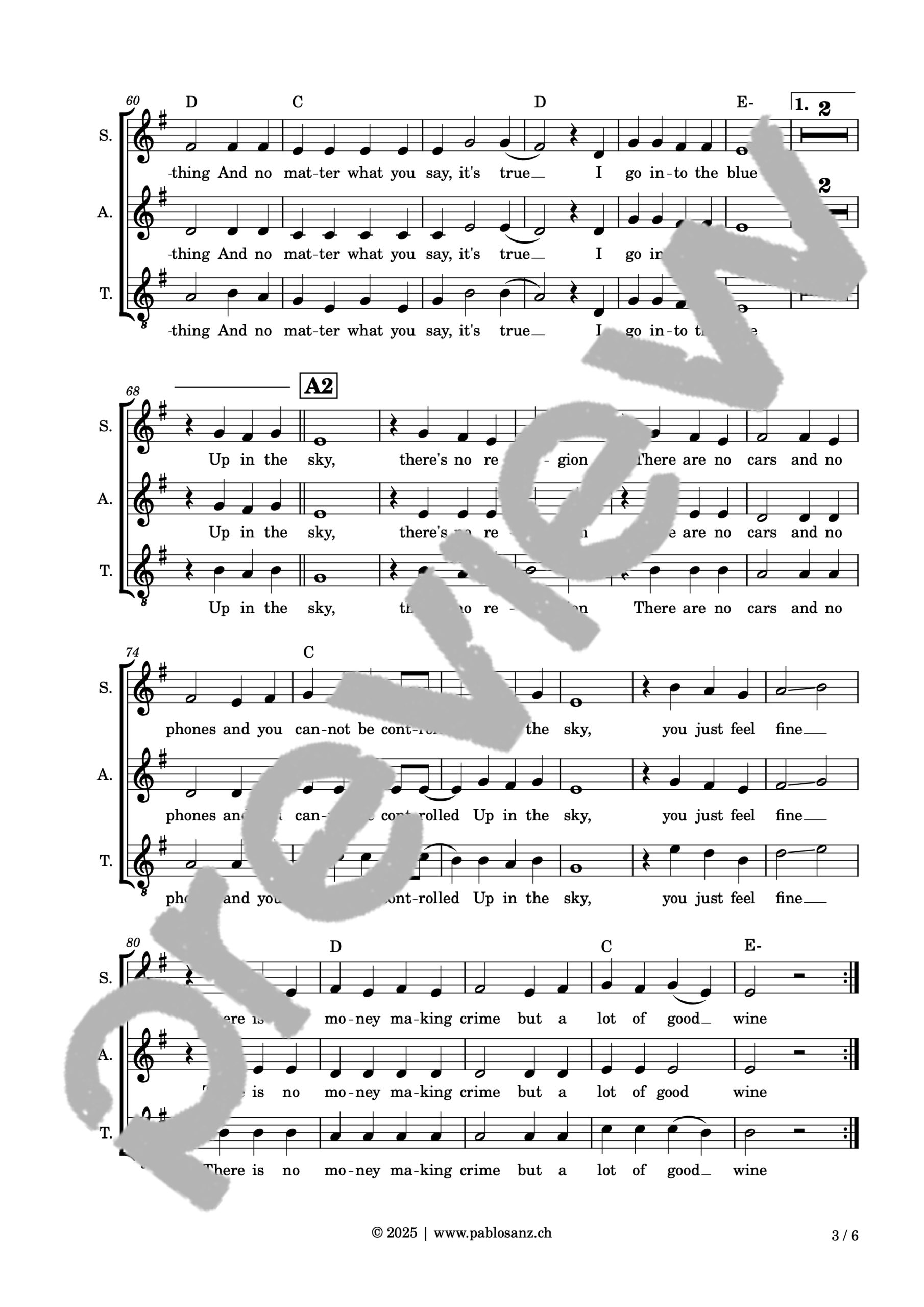Bien qu’elle soit chantée en anglais, « Up In The Sky » est bel et bien une chanson de chez nous ! En effet, 77 Bombay Street est un groupe formé de quatre frères suisses. C’est local et c’est beau ! La mélodie principale de ce titre entraînant est partagée entre les sopranos et les ténors, principalement. L’arrangement évolue crescendo, laissant s’élargir l’éventail harmonique des voix, faisant même intervenir une voix additionnelle lors du pont (solo ou petit groupe), et finissant en beauté avec un dernier refrain explosif qui vous fera danser. Un accompagnement au piano ou par plusieurs instruments est souhaitable. 6 pages.