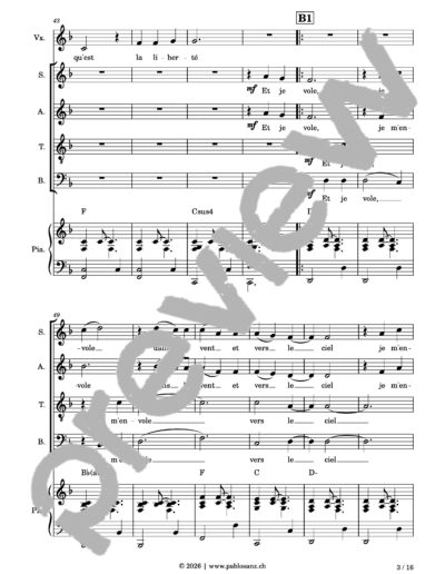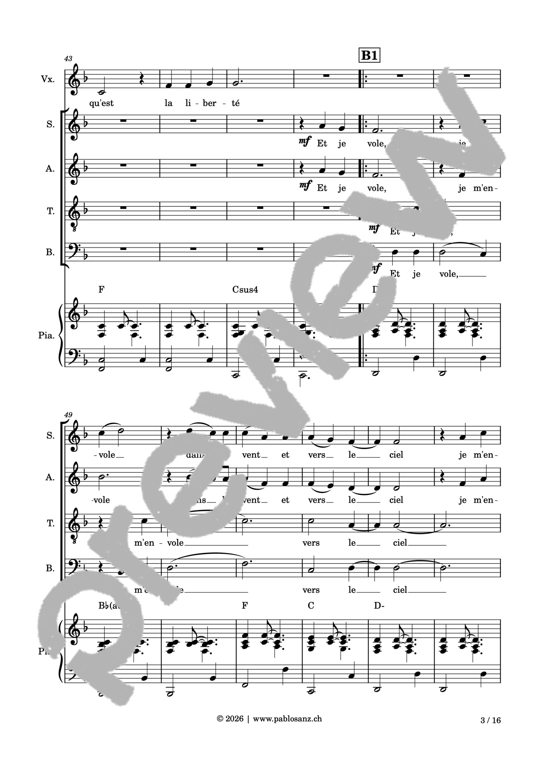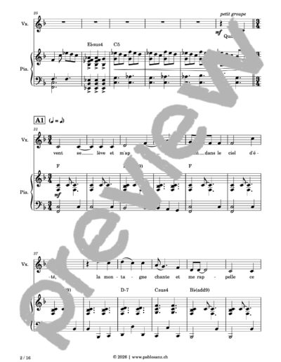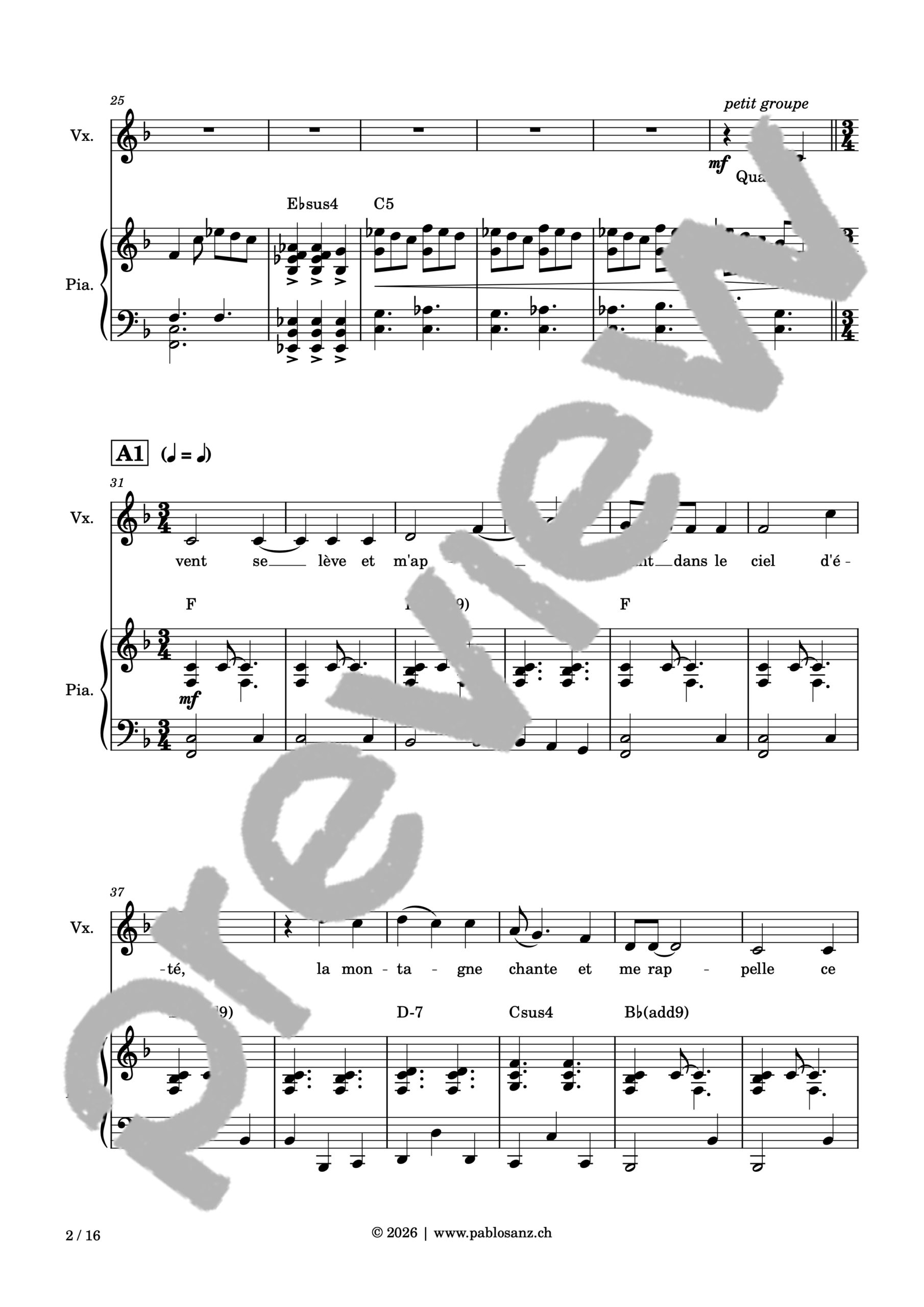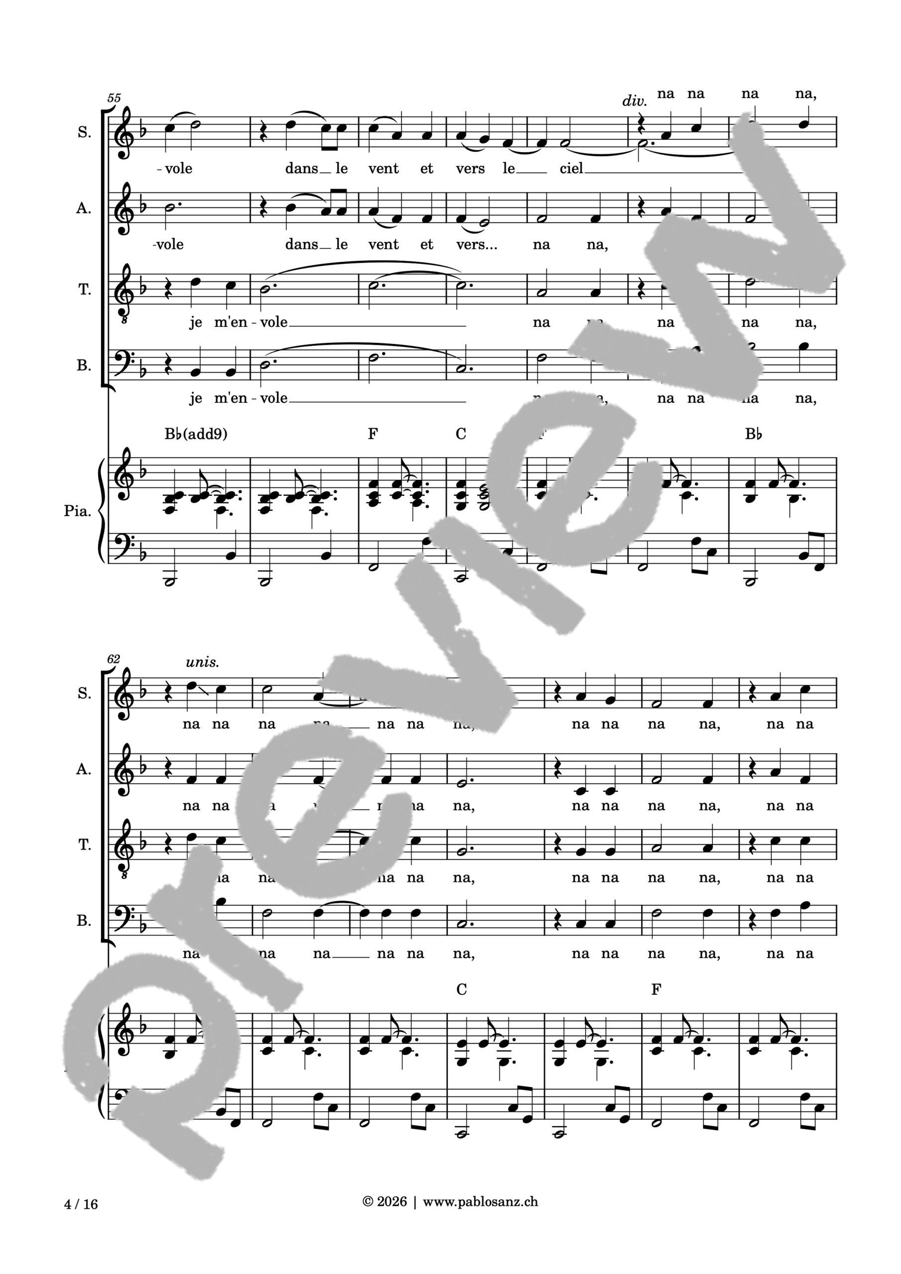 Toutes les interventions instrumentales ont été préservées et adaptées pour un accompagnement au piano. Ainsi, la partition existe sous 3 formes : chœur et piano (16 pages), chœur seul (9 pages), piano seul (8 pages). Plaisir garanti !
